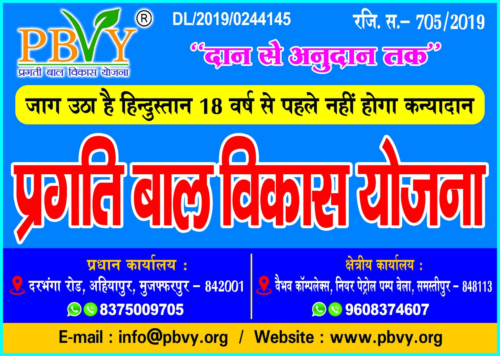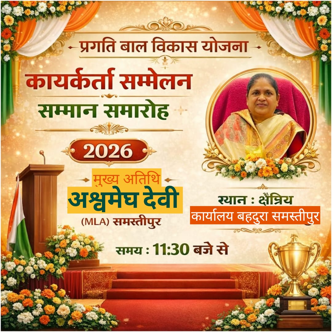 प्रगति बाल विकास योजना सादर निमंत्रण, हमें आपको सूचित करते हुए अत्यंत हर्ष हो रहा है कि संस्था द्वारा "कार्यकर्ता सम्मेलन सह सम्मान समारोह 2026" का भव्य आयोजन किया जा रहा है। इस गौरवशाली अवसर पर मुख्य अतिथि के रूप में माननीया अश्वमेध देवी जी (विधायिका, समस्तीपुर) उपस्थित रहेंगी और कार्यकर्ताओं का मार्गदर्शन करेंगी। कार्यक्रम के मुख्य आकर्षण: अतिथियों का सम्मान एवं प्रेरक संबोधन कार्यकर्ताओं एवं बच्चों हेतु सम्मान समारोह (टैबलेट, मेडल व पुरस्कार वितरण) मनमोहक सांस्कृतिक नृत्य एवं नुक्कड़ नाटक आपकी गरिमामयी उपस्थिति हमारे कार्यकर्ताओं का उत्साहवर्धन करेगी। कार्यक्रम के उपरांत सामूहिक प्रीतिभोज में आपकी उपस्थिति प्रार्थनीय है। दिनांक: 25 जनवरी 2026 स्थान: मुजफ्फरपुर, बिहार विनीत: रविंद्र कुमार कुशवाहा (सचिव) एवं समस्त प्रगति बाल विकास योजना परिवार।