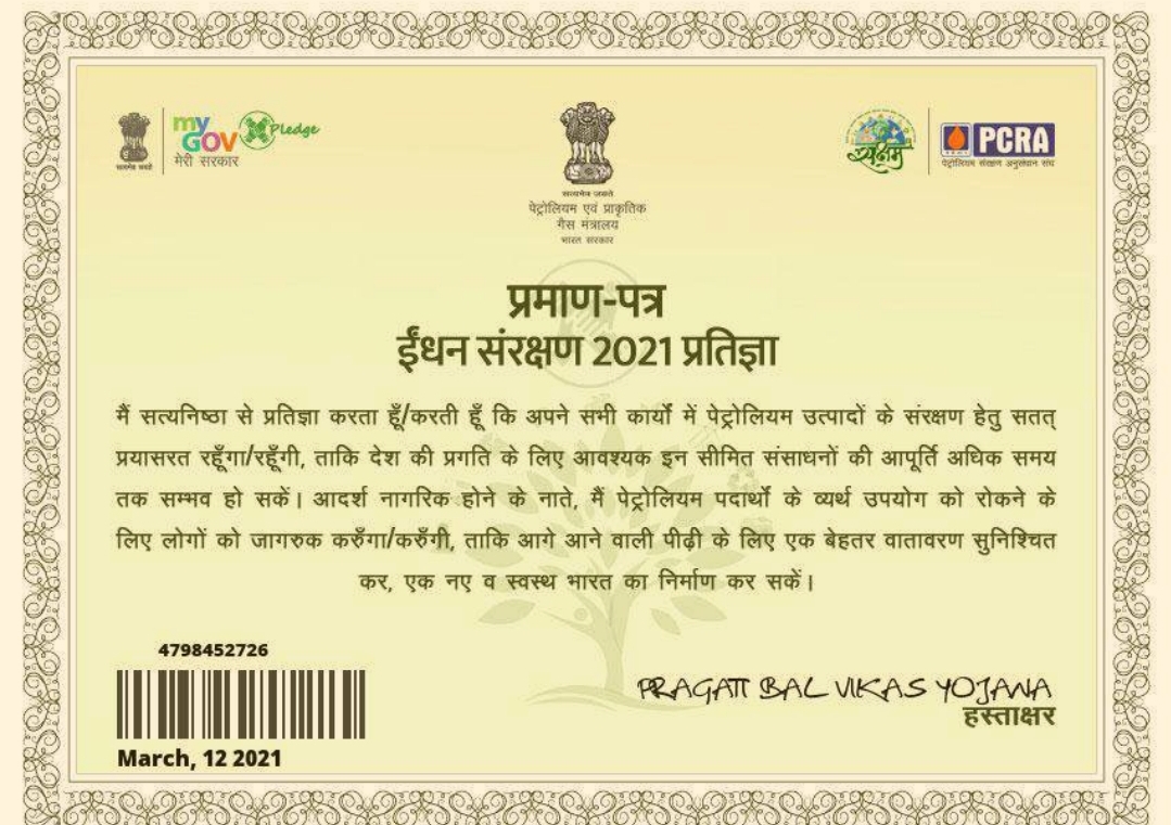 ईंधन संरक्षण प्रतिज्ञा प्रमाण पत्र