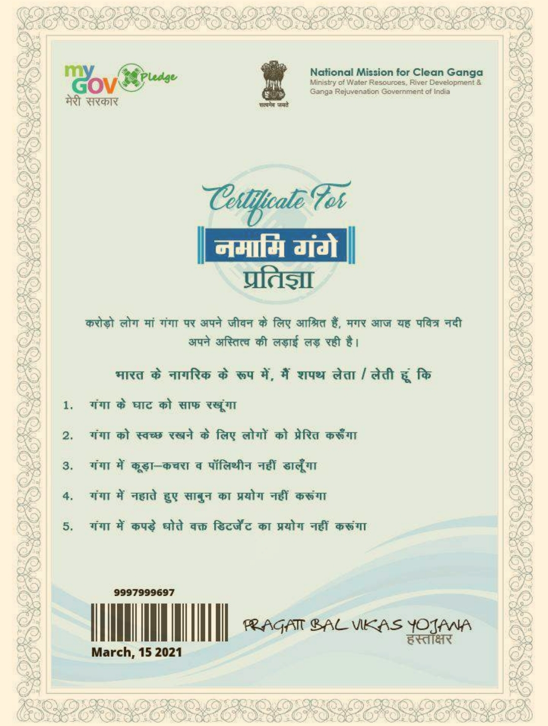 नमामि गंगे शपथ प्रमाण पत्र