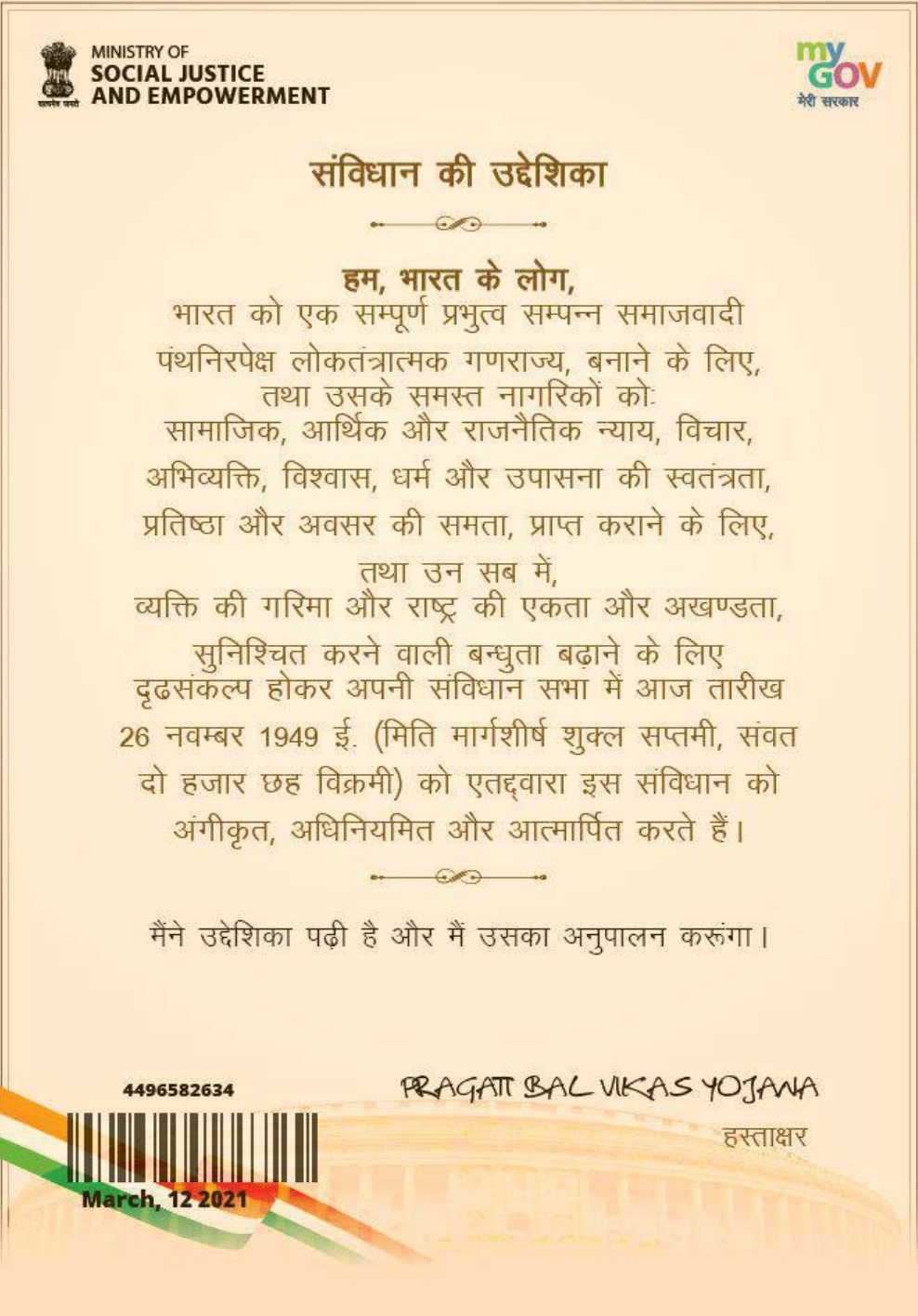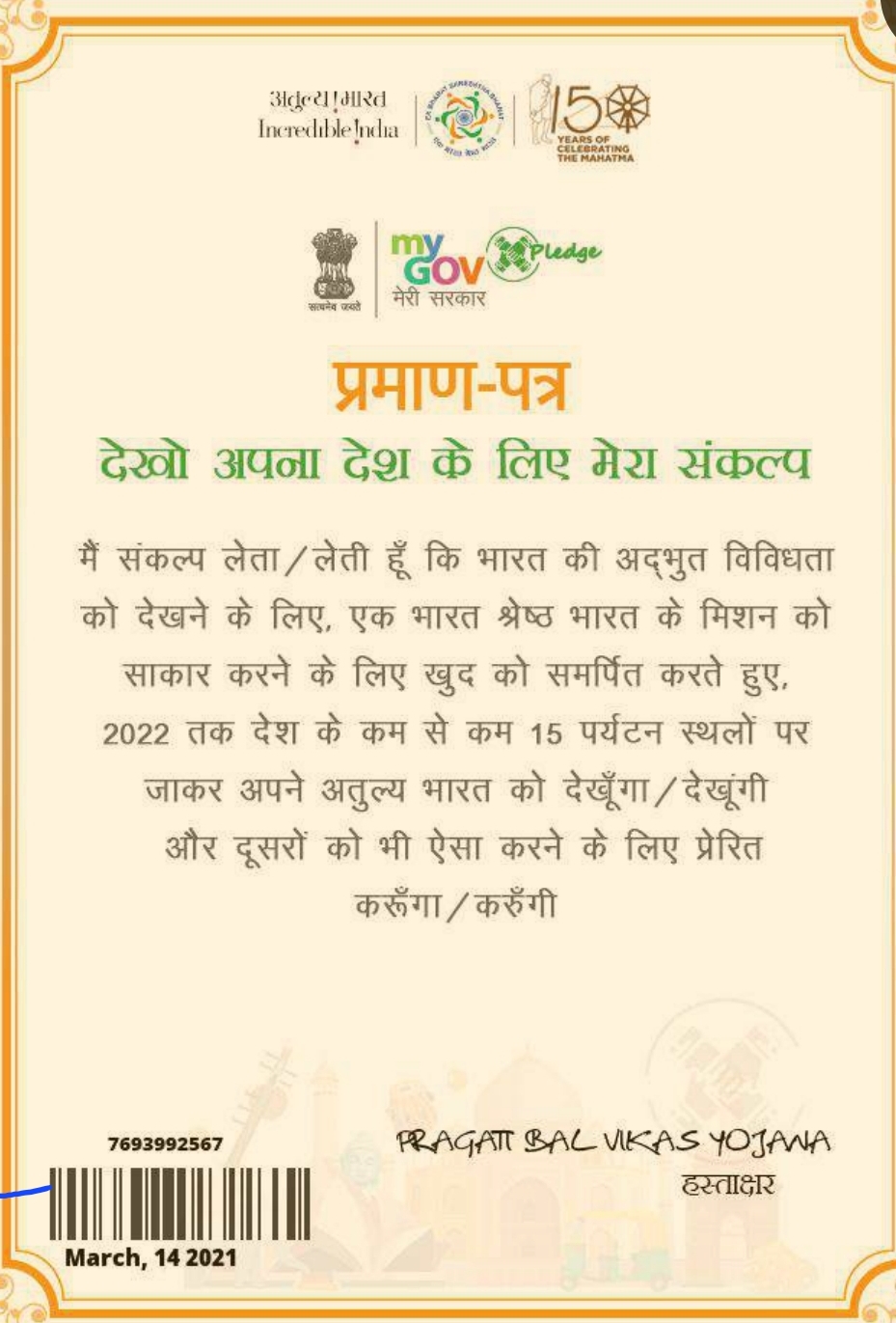 आत्मनिर्भर भारत शपथ प्रमाण पत्र