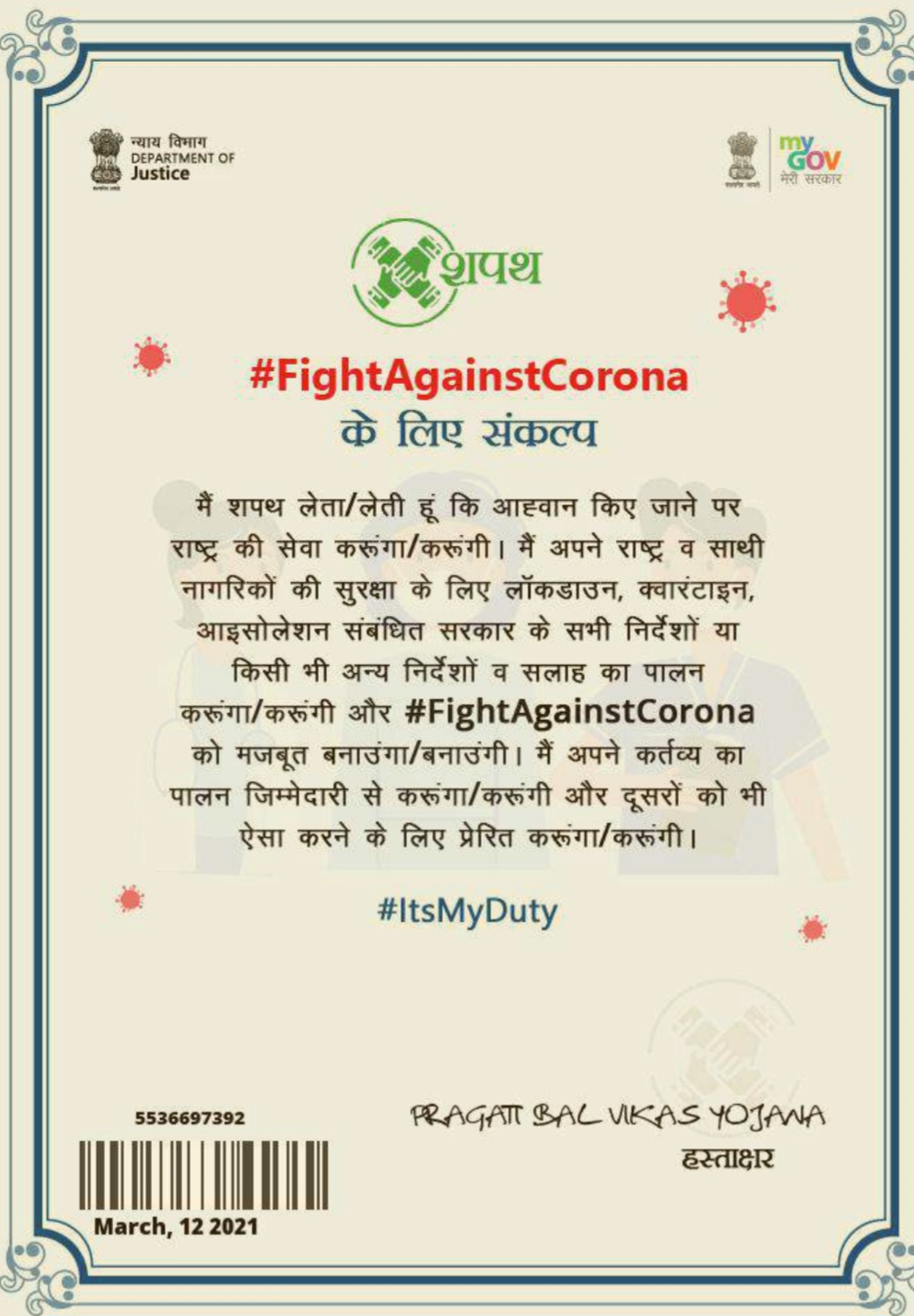 कोरोना शपथ प्रमाण पत्र